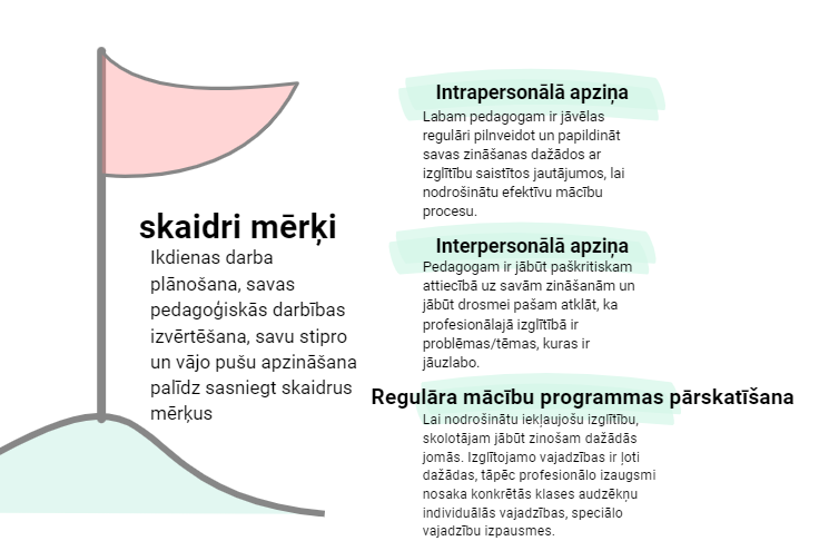Skaidru mērķu sasniegšanai palīdz ikdienas darba plānošana, savas pedagoģiskās darbības izvērtēšana, nosakot savas stiprās un vājās puses. Savas pedagoģiskās darbības izvērtēšana sniedz iespēju noteikt, kurās jomās nepieciešams uzlabot savu profesionālo darbību, lai efektīvāk varētu attīstīt un pilnveidot izglītojamo prasmes un iemaņas, atbilstoši katra individuālajām vajadzībām. Vispirms jāspēj apzināties, ka pastāv kādas grūtības vai traucējoši faktori, kas apgrūtina pilnvērtīgu mērķu sasniegšanu.